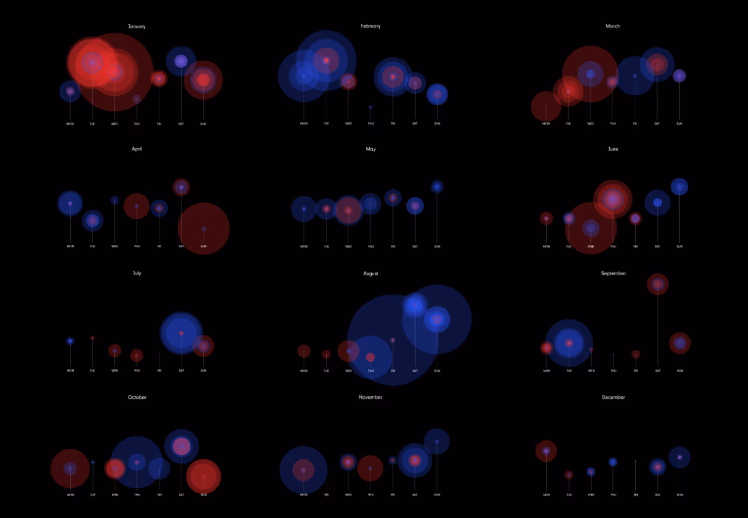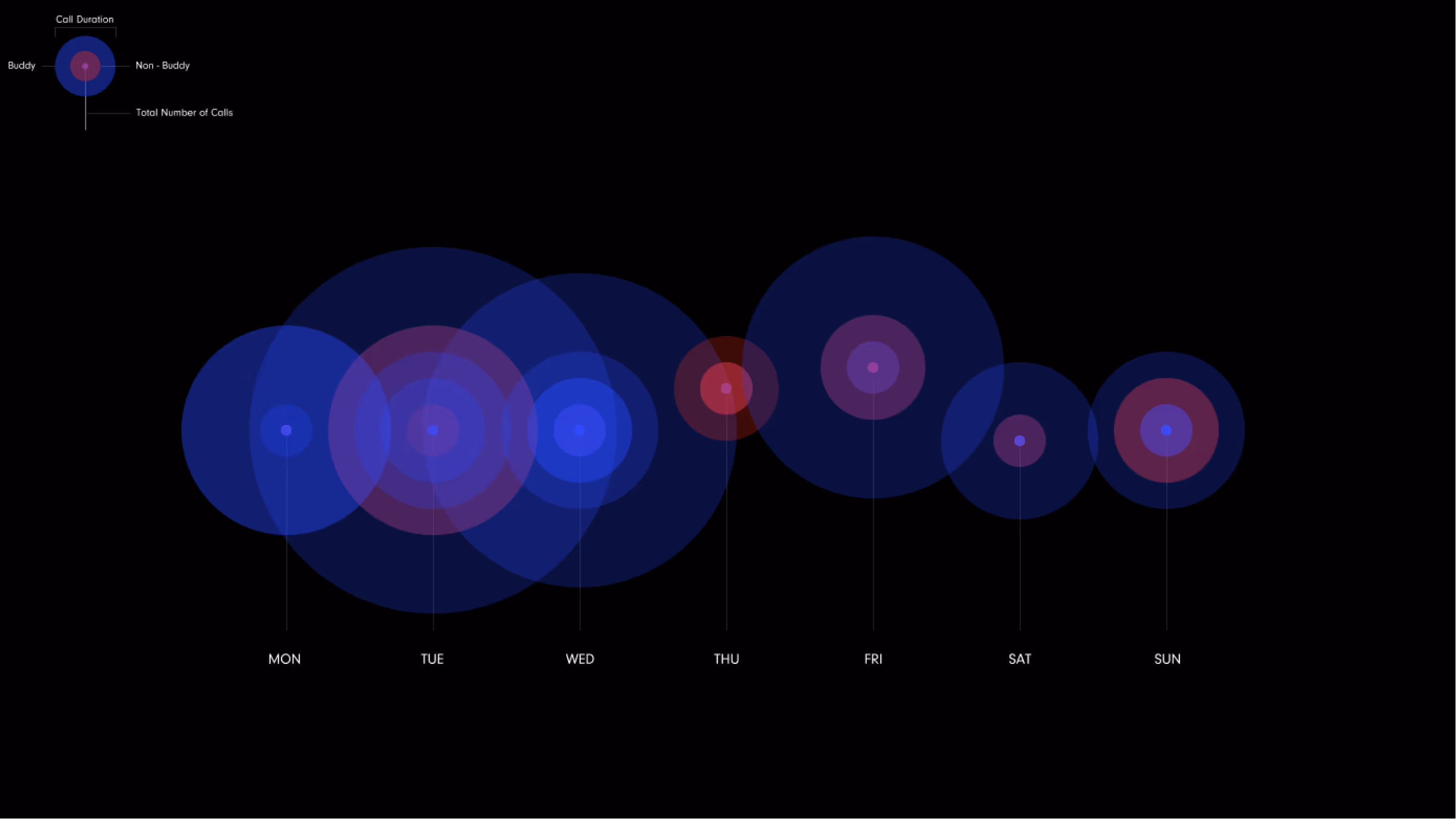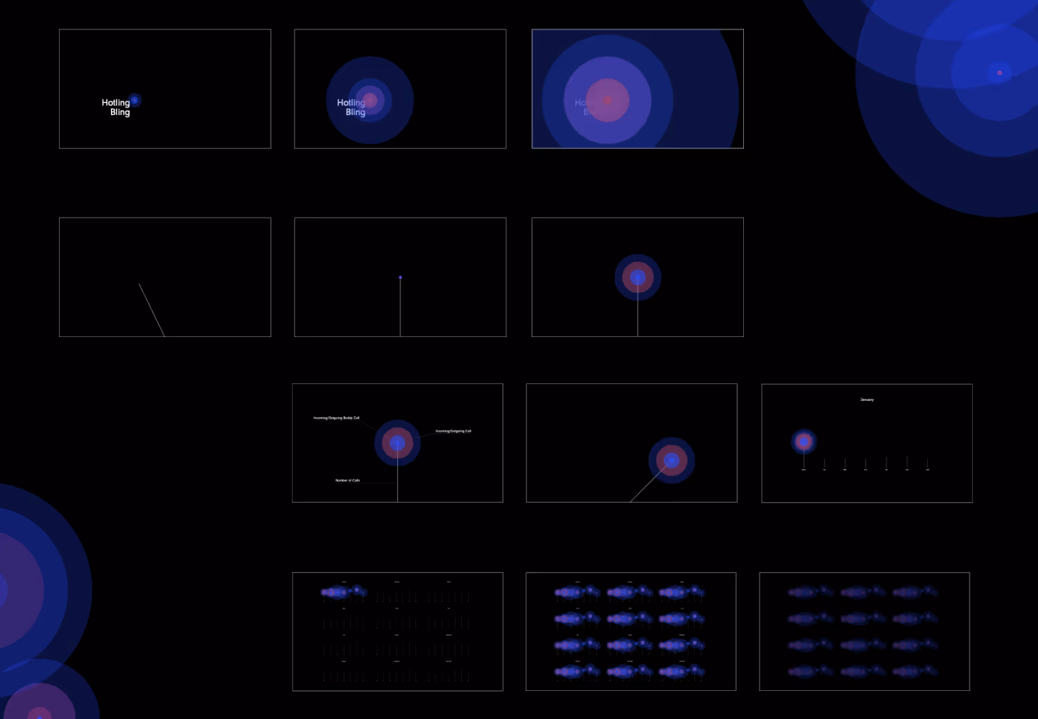 Hotline Bling is an animated data visualization that showcases data from a person's calls throughout an entire year. The goal of this motion graphic was to bring life and personality to the data. Additionally, the motion graphic would provide interesting insights and information to the data as well. For this animated visualization, it was made to show the call duration, number of calls made and call type for each day of the week of that month. The types of calls vary from buddy outgoing or incoming and non-buddy outgoing or incoming calls. As shown in the motion graphic, the buddy calls are shown as blue circles and the non-buddy calls as red circles. Through these circles, the data can overlap and showcase variation in hues to provide insight and information into the different days of the week.